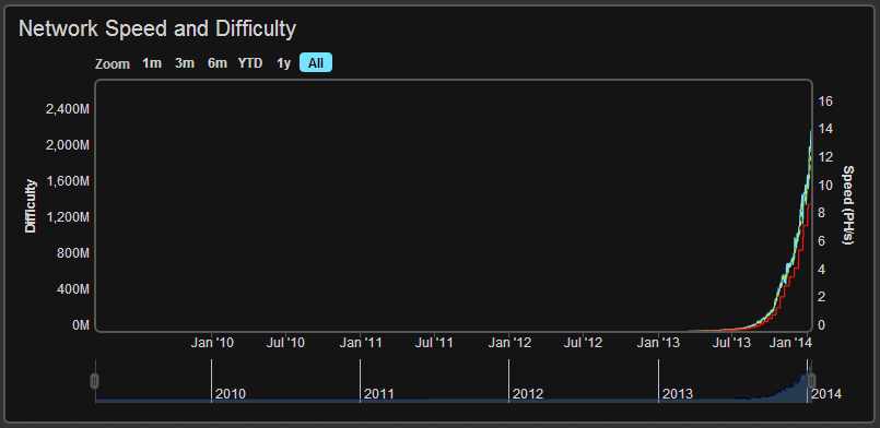 Согласно официальной версии, после старта сети биткойн легендарный Сатоши Накамото первый год майнил сам. Потом, когда биткойн стал достоянием общественности, к нему присоединились первые энтузиасты. Это было время, когда сложность была настолько низка, что биткойны можно было добывать самым простым компьютером, даже без видеокарты. Потом, в течение двух следующих лет сеть начала медленно расти. Про биткойн узнавало все больше людей, среди них находилось все больше энтузиастов, но по прежнему он оставался уделом гиков и людей, хорошо разбирающихся в компьютерах и программном обеспечении. Пока не пришел 2013 год и цена биткойна просто взорвалась. Это привлекло к нему миллионы новых пользователей, немало из которых смекнули, что дешевле добыть свои биткойны, чем покупать их на бирже. С этого момента начался период небывалого роста мощности сети и, соответственно, сложности. Чтобы понять масштабы происшедшего, мы вам приведем небольшую сравнительную табличку роста мощности сети и сложности за последние 4 года.